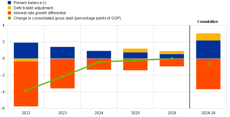 The ratio of euro area government debt to GDP is projected to remain above its pre-pandemic level and to decline only slowly from an estimated 88.7% in 2023 to 88.1% in 2026. The debt ratio increased by approximately 13 percentage points to around 97% in 2020 but has gradually fallen since and is expected to continue to fall over the projection horizon, albeit at a significantly slower pace. The projected decline is based on narrowing but still negative differentials between interest rates and nominal GDP growth, which are partly offset by the continuing primary deficits and by expected positive deficit-debt adjustments in the second half of the projection horizon (Chart 28).