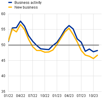 Activity is expected to remain weak in the final quarter of 2023. Industrial production data for October suggest an ongoing contraction in manufacturing output in the fourth quarter. Incoming survey data – available for the period to November – point to a broader-based weakening of activity in the fourth quarter. This reflects both the continued weakness in manufacturing activity and a greater deceleration in services, which had previously shown resilience. The composite output Purchasing Managers’ Index (PMI) continued to fall further below the growth threshold of 50 and below its third-quarter average, despite a small uptick in November on the October reading, possibly suggesting a bottoming out of the negative trend. The PMI for manufacturing output remains deep in contractionary territory, as earlier support from improved supply chain conditions looks to have run its course and backlogs of work are drying up, while new orders continue to contract (Chart 5, panel a). The weakness in activity is also evident – although less pronounced – in the services sector, where the PMI indicators for both business activity and new business have remained below the growth threshold since August (Chart 5, panel b). The European Commission’s Economic Sentiment Indicator declined somewhat further below its third-quarter average in October and November, reflecting lower confidence among consumers and firms alike, albeit with some tentative signs of the weakness in confidence bottoming out in November. At the same time, firms across services and particularly manufacturing reported weaker demand and tightening financing conditions as increasing limits to production in the fourth quarter of the year.[3]