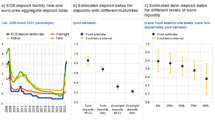 Interest rates on “new” term deposits[2] for both non-financial corporations and households have risen since the start of the monetary policy tightening cycle, while overnight deposit rates have remained relatively sticky. Euro area banks have, to some extent, passed on increases in policy rates to the benefit of both non-financial corporations and households. This applies in particular to interest rates on term and notice deposits. Between June 2022 and March 2023, interest rates on term deposits increased by about 2.44 percentage points, interest rates on notice deposits increased by about 75 basis points respectively, while interest rates on overnight deposits increased only modestly, by about 25 basis points. In this context, the sensitivity of banks’ deposit rates to changes in interest rates, the so-called “deposit beta”, plays a key role.