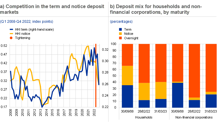 Notes: Panel a: the Herfindahl-Hirschman index (HHI) is calculated by squaring the market shares of the term or notice deposits of each bank operating in a country and then aggregating the resulting numbers. A lower HHI indicates stronger competition. Based on a sample of 158 euro area banks. Panel b: outstanding deposit volumes by maturity bucket and reported as a share of total deposits.