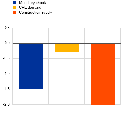 Notes: Panel a: historical decomposition from a BVAR model based on the approach taken in de Nora et al.* but adapted to examine drivers of CRE price growth. The model is a Bayesian VAR of order 2, fitted on euro area data over the period from Q1 2003 to Q3 2023. The model includes the following endogenous variables: CRE prices, real estate investments, lending to NFCs, NFC income (gross operating surplus), GDP, CPI, lending rates and the euro area shadow rate. Structural shocks are identified via zero and sign restrictions. The chart shows the response to (i) a monetary policy shock triggering an increase of 1 percentage point on the policy rate on impact, (ii) a 3 standard deviation CRE preference shock, and (iii) a 3 standard deviation CRE supply shock. NFC stands for non-financial corporation.