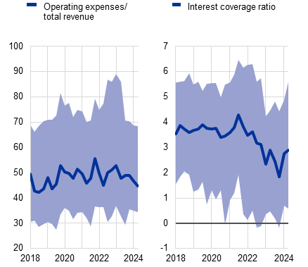 Real estate firms’ revenue growth has not kept pace with their financing costs, which has potential implications for their repayment capacity. Unlike asset write-downs, falling revenues or rising costs will affect the resources available to firms to meet debt repayments. As a result, fluctuations in these factors will have immediate implications for credit quality. For the sample of firms examined, the ratio between revenue and expenses remained broadly stable over the period studied, suggesting that this sample of large firms has not seen capex costs exceeding their rental growth (Chart B, panel b).[3] While rental growth has kept pace with expenses for large firms, financing costs have increased disproportionately. The median real estate firm saw its interest coverage ratio drop from 4x to 2x over the course of the monetary tightening cycle, although with some recovery since the start of 2024 (Chart B, panel b). This will likely have immediate implications for the capacity of firms to meet debt repayments, with clear spillovers to bank and market credit risk. While any potential further monetary easing may reduce pressure on repayment capacity in the coming quarters, firms may still see financing costs rise as the debt that originated during the period of ultra-loose monetary policy matures. Indeed, as of June 2024 20% of loans to euro area real estate firms were due to mature within two years.[4]
