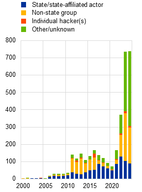This box draws on data from the EuRepoC database, which collects information on cyber incidents based on publicly available sources such as newspaper reports, also tracking attributions of attacks to threat actors. As such, it is likely not fully representative of the true threat landscape. Patterns over time can be influenced by factors related to how data are collected, the extent to which cyberattacks are reported and changes to regulatory disclosure requirements. In addition, it is difficult to attribute cyberattacks to specific actors, especially due to an often high degree of plausible deniability. Data for this box were downloaded on 26 February 2025 and include incidents up until 25 February 2025. For a stable version of the data set see Zettl-Schabath, K., et al., “Global Dataset of Cyber Incidents (1.3.2)”, European Repository of Cyber Incidents, 2025.
