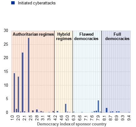 Notes: Both panels only show cyberattacks conducted by nation-state actors or non-state actors for whom a state affiliation is suggested. Panel a: the democracy index and classification of political regimes refers to the 2024 democracy index of the Economist Intelligence Unit. It scores countries on a scale from zero to ten, based on 60 indicators from the following five categories: electoral process and pluralism; functioning of government; political participation; political culture; and civil liberties. Initiated cyberattacks include all attacks covered by the EuRepoC database between January 2000 and 25 February 2025. Panel b: the main sponsors are a group of four countries; the main targets are a group of seven countries. The number of cyberattacks initiated/suffered is the sum across these groups. The geopolitical risk index and the economic policy uncertainty index are available for two of the main sponsoring countries. Of the main targeted countries, the geopolitical risk index is available for all seven, while the economic policy uncertainty index is only available for five. Indices are averaged and standardised for each group across the countries for which the indices are available.