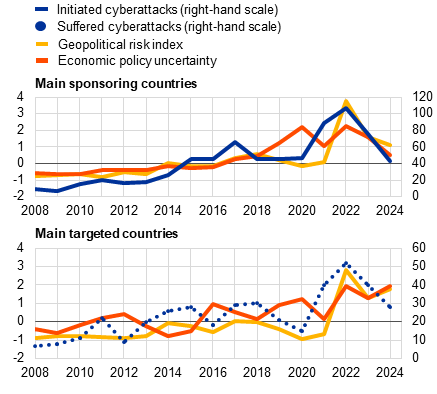 Geopolitical rivalry is increasingly playing out in cyber space, with most state-sponsored cyberattacks originating from a handful of countries. Historically, the main tool used to settle geopolitical disputes between countries has generally been armed conflict. However, the toolkit employed alongside diplomacy to achieve strategic goals without resorting to physical force has evolved. The effectiveness of the tools employed depends heavily on the geoeconomic and political position of the countries involved. At the same time, hybrid techniques, including espionage, infrastructure sabotage and influence campaigns, are increasingly being used to pursue conflicts by other means. While such techniques are not new, the rise of the internet and digitalisation since the 1980s has turned cyber space into a key battleground where such activities may be carried out and has opened up new avenues of attack. As such, the degree to which countries have used cyberattacks to further their national interests varies greatly, with a relatively small cluster of countries, often classified as authoritarian regimes, being responsible for the majority of state-sponsored attacks (Chart B, panel a). Such cyberattacks are clearly linked to geopolitical risk factors, but policy uncertainty in both sponsoring countries and targeted countries also seems to play a role at times. The frequency of state-sponsored cyberattacks tends to increase when sponsoring countries encounter geopolitical risks or economic policy uncertainties. Similarly, target countries experience more attacks under conditions of heightened geopolitical risk or economic policy uncertainty (Chart B, panel b).