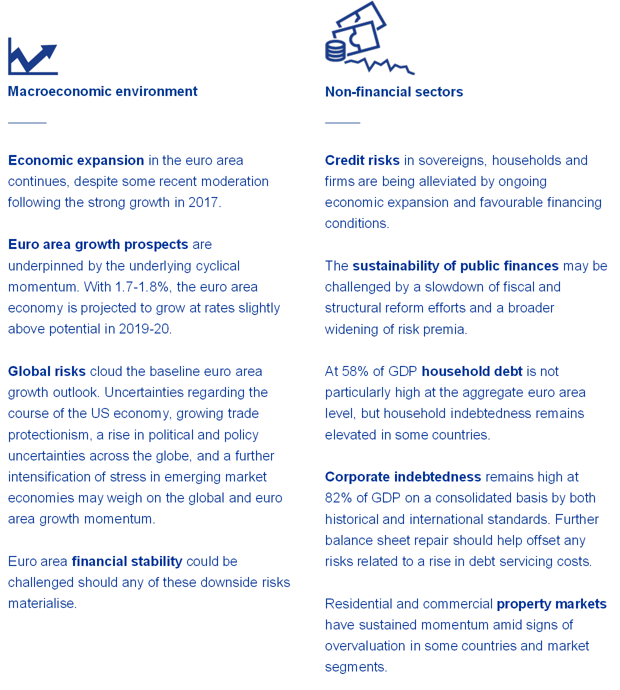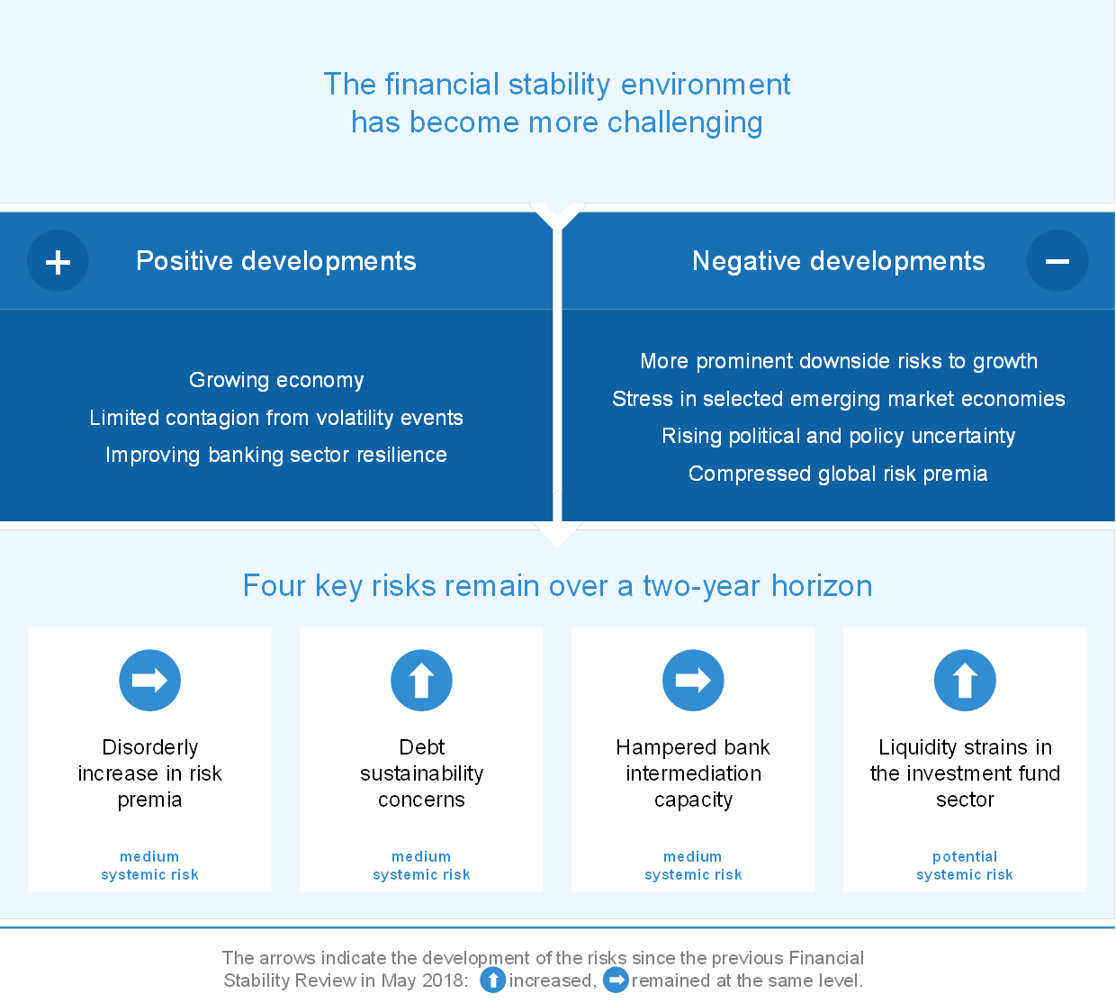 The euro area financial stability environment has become more challenging since the publication of the previous Financial Stability Review in May. On the positive side, a growing economy and improved banking sector resilience have continued to support the financial stability environment in the euro area. Furthermore, a series of volatility events have not spread to the broader global financial system. At the same time, downside risks to the global growth outlook have become more pronounced since May relating to a resurgence in protectionism and stress in emerging markets. Vulnerabilities in financial markets continue to build up amid pockets of high valuations and compressed global risk premia. In the euro area, political and policy uncertainty have increased over the review period.