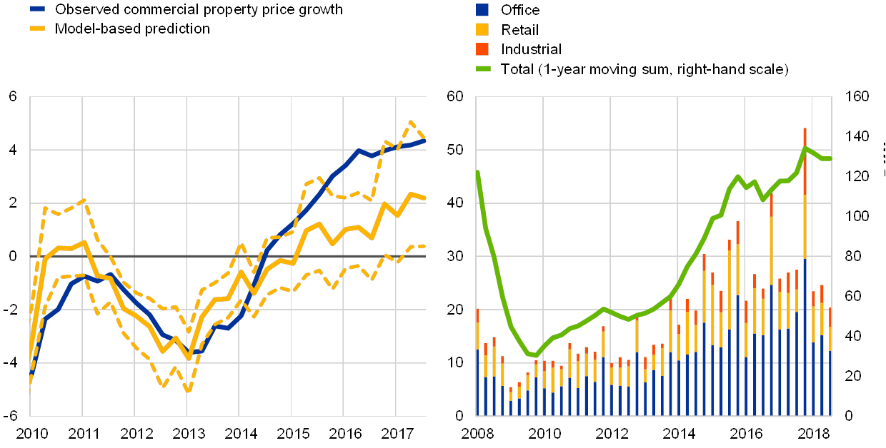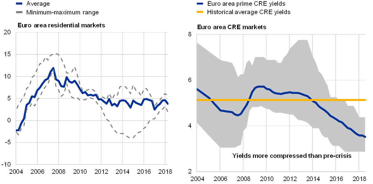 Euro area residential property price deviations from estimated fair value (left panel) and euro area prime CRE yields (right panel)