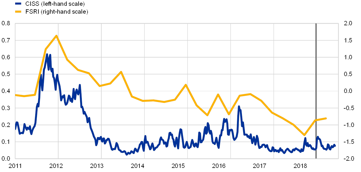 Notes: For more details about the CISS, see Holló, D., Kremer, M. and Lo Duca, M., “CISS – a composite indicator of systemic stress in the financial system”, Working Paper Series, No 1426, ECB, March 2012. For more details on the FSRI, see Special Feature A in the May 2018 FSR. The scale of the FSRI represents the deviation from the historical mean expressed in multiples of the historical standard deviation. The CISS is normalised to lie between 0 and 1. FSRI: quarterly frequency; CISS: weekly frequency, two-week moving average. The black vertical line represents the publication of the previous FSR.