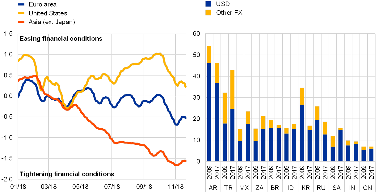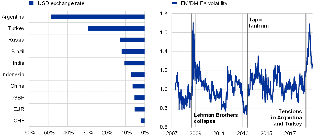 At the global level, some EMEs with significant external imbalances are facing difficulties in adapting to tightening financial conditions. A stronger US dollar and heightened trade tensions unearthed pre-existing vulnerabilities in Argentina and Turkey, triggering renewed stress in EMEs in recent months. A number of EMEs endured significant increases in bond spreads, falling stock prices and large currency depreciations (see Chart 3). However, the EME sell-off was more muted and contained when compared with the widespread stress that occurred during the “taper tantrum” episode in 2013.