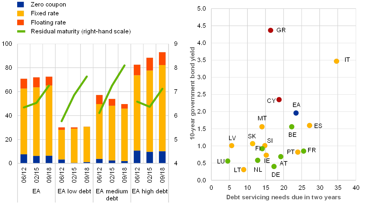 A large public sector debt overhang leaves several countries vulnerable to higher funding costs. Public sector debt in almost all of the largest advanced economies is significantly higher today than the levels prevailing before the eruption of the global financial crisis (see Chart 9, left panel). Looking ahead, a failure to rein in fiscal deficits would place debt trajectories on a clear upward path in countries where debt ratios are already above 90% (see Section 1.2). Furthermore, private sector debt levels remain high by both historical and international standards and are above thresholds ordinarily associated with a debt overhang, although debt dynamics have continued to benefit from the strong cyclical momentum of the euro area economy combined with very favourable financing conditions.