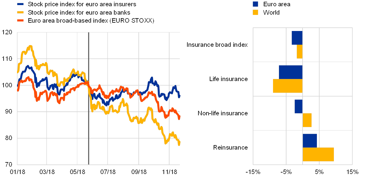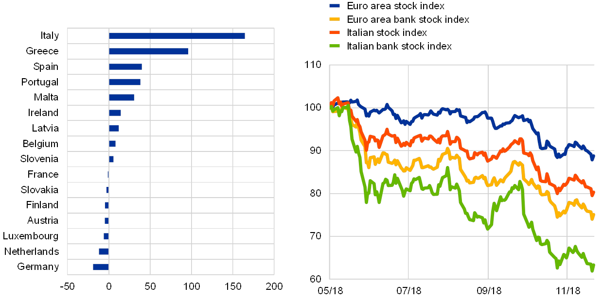 (left panel: daily data, changes in basis points between 1 May 2018 and 21 Nov. 2018; right panel: daily data, 1 May 2018-21 Nov. 2018, stock prices indexed to 100 on 1 May)