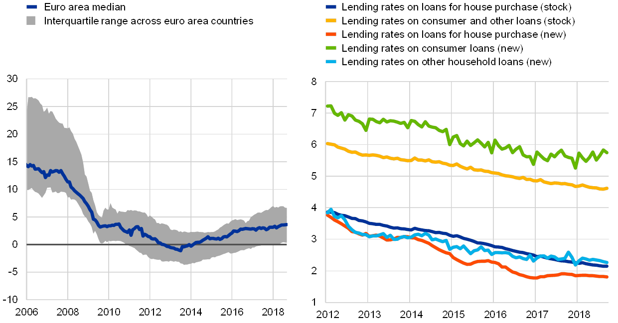 Bank profitability in the euro area has remained persistently weak, ten years after Lehman Brothers filed for bankruptcy. The banking crisis and subsequent recession that followed the failure of Lehman Brothers contributed to a sharp fall in global banks’ profitability. Euro area banks’ earnings have been particularly weak (see Chart 11). The low bank profitability in the euro area over this period is partly related to the fact that the crisis in the euro area was more protracted than that in other mature economies. Apart from cyclical factors, structural elements of the euro area banking system have also probably contributed to the underperformance – including overcapacity in certain domestic banking markets and high operating costs (see also Special Feature A). Looking at the most recent data and a broad set of banks, the annualised return on equity of euro area significant institutions slightly dropped in the first half of 2018 from a year earlier, but remained above 7%. Continuing the trend of the last few years, a fall in impairment costs was the largest positive contributing factor in the first half of 2018, helped by a favourable macroeconomic environment and banks’ continued efforts to reduce their non-performing loans. All in all, profitability prospects still remain weak and constitute a key risk to financial stability in the euro area since weak profitability can hamper banks’ intermediation capacity.