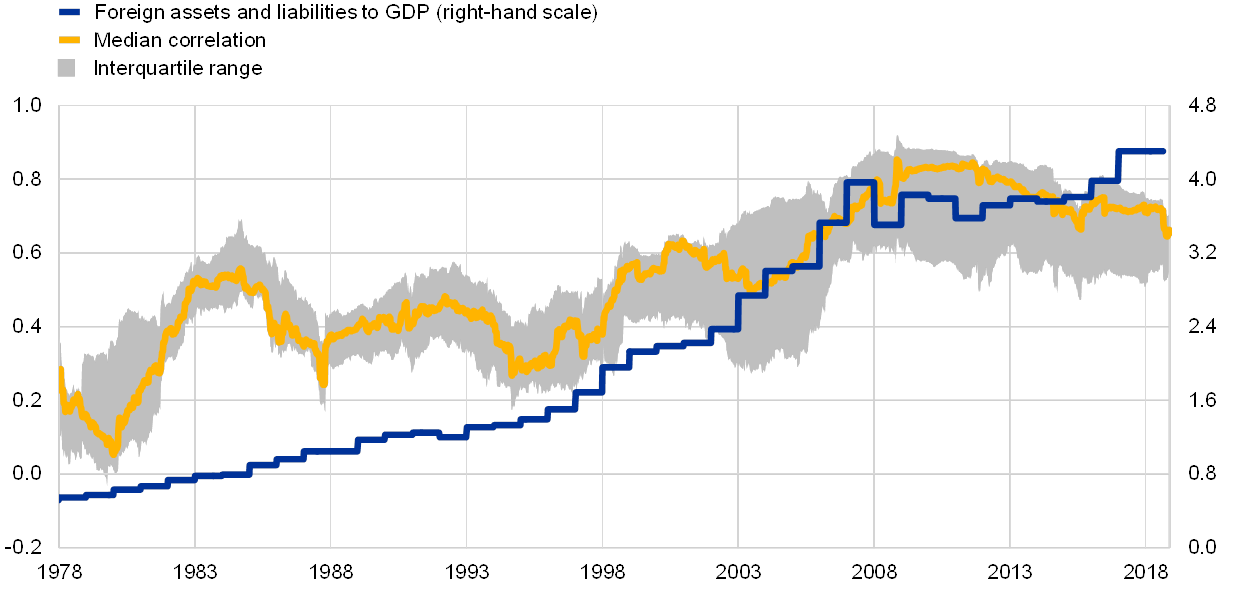 Bilateral correlations between global stock markets, median correlation and foreign assets and liabilities-to-GDP ratio