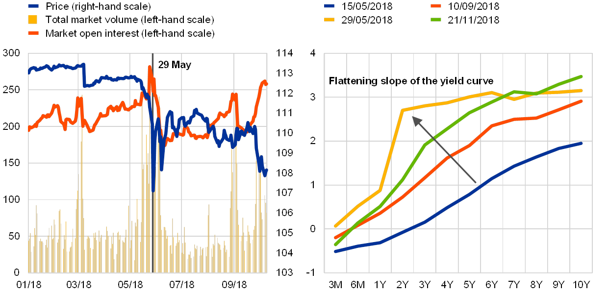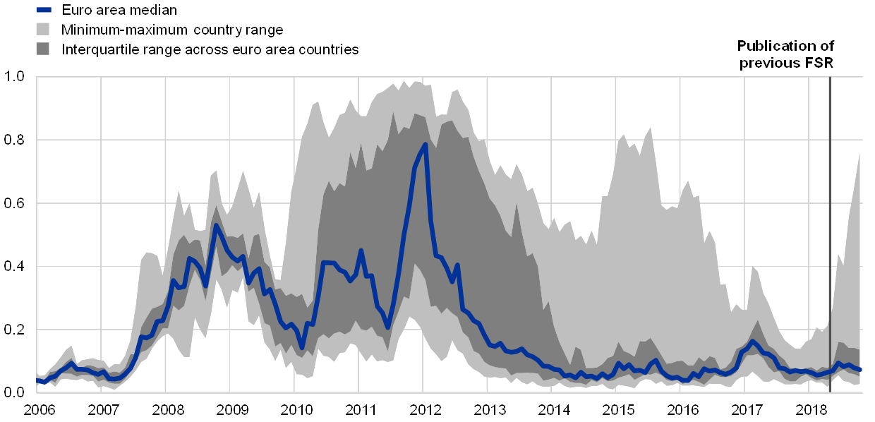 Italian financial market losses amid political uncertainty have not meaningfully spilled over to other euro area countries. In the second half of May, increased market concerns about debt sustainability – triggered by rising fiscal policy uncertainty in Italy – contributed to higher volatility in domestic financial markets (see Chart 2). Sovereign bond yields in Italy increased sharply, amplified by deteriorating liquidity conditions. Some domestic spillover to the non-financial and financial sectors was also observed. At the same time – in contrast to euro area financial stress episodes in 2011-12 – contagion to other euro area countries was limited. Subsequently, market sentiment stabilised somewhat, but Italian sovereign bond yields and stock prices remained volatile throughout the review period. Financial market tensions combined with protracted budgetary negotiations have culminated in credit rating actions. The stress in the Italian sovereign debt markets in May serves as a reminder of how quickly policy uncertainties can lead to shifts in market sentiment and a repricing of risk. In the latter part of the review period, rising bond yields in the United States triggered a rise in global risk premia with some limited spillover also to the euro area.