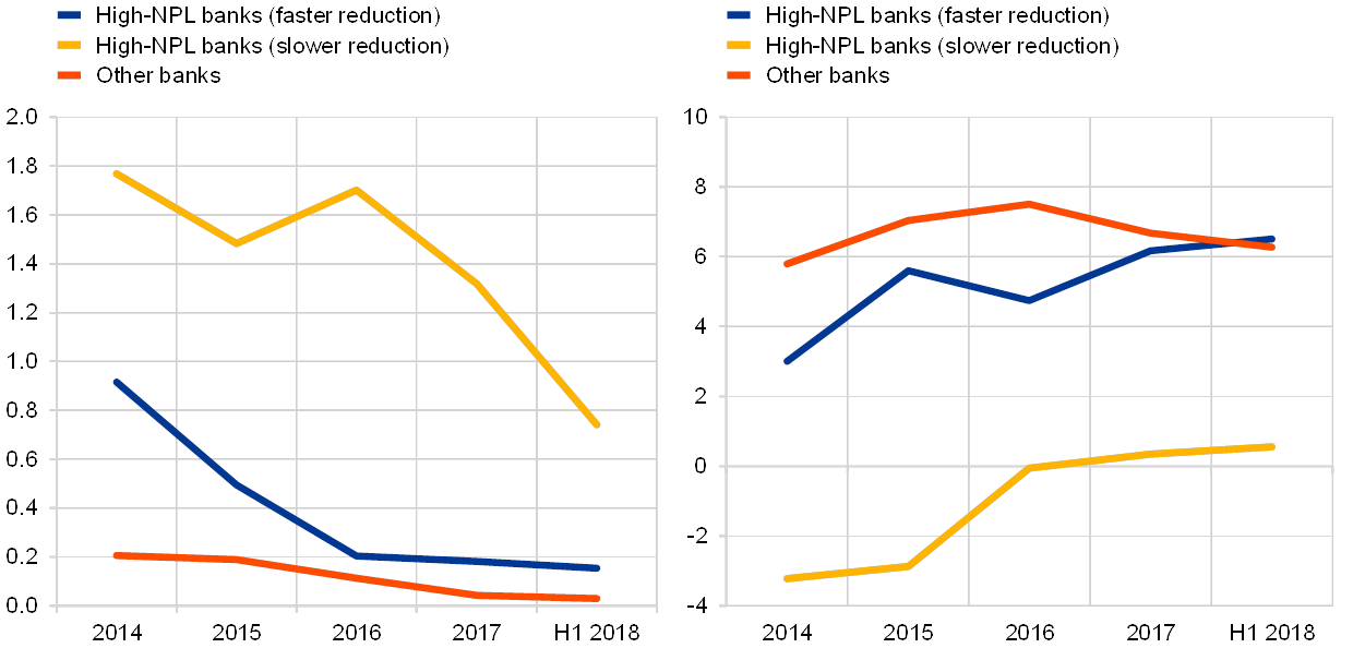 27. Under IFRS (International Financial Reporting Standards) rules, it is possible for banks to book interest income on certain parts of NPLs. The median share of interest income accrued on impaired loans was 7.6% within the group of high-NPL banks in the first half of 2018, with the variation across banks broadly in line with the level of NPL ratios.