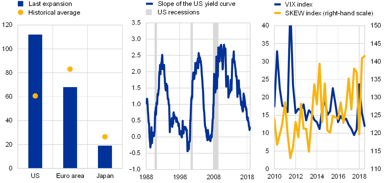 A maturing cycle in the United States has led to brittle valuations. Developments in the US economy and financial markets, in turn, have continued to exert a dominant influence in global financial markets. The US economy has continued to grow at a brisk pace in 2018, supported by a favourable job market. The strong fiscal stimulus has added further momentum to the US business cycle and contributed to prolonging the current economic expansion which is now significantly longer than historical norms and the second longest in US modern history (see Chart 5). Looking ahead, a number of market indicators appear to signal downside risks to the macro-financial cycle in the United States. First, the slope of the US yield curve has flattened significantly in recent quarters. In the past, this has been a harbinger of future recessions. Second, investors seem to have become increasingly concerned about price increases in “riskier” US asset classes, stock markets in particular. Despite low volatility, the SKEW index, which gauges the cost of insuring against large drops in stock prices, has increased sharply in recent months as stock prices have risen.