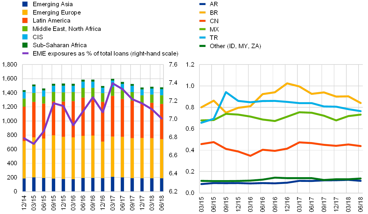 Looking ahead, more generalised stress in EMEs could materialise. The sell-off in May illustrates that global risk sentiment remains fickle. Several EMEs have accumulated large US dollar-denominated debts and would face very high credit risk in the event of a sharp US dollar appreciation. Thus, a quicker than expected US policy normalisation and a subsequent appreciation of the US dollar may trigger an abrupt and broad increase in risk premia on EME financial assets. The expansionary fiscal policy in the United States could aggravate a potential pick-up in risk premia. Widespread contagion across EMEs could also be triggered by rising trade tensions and/or a failure to rein in the high credit growth in China, leading to a hard landing. Contagion across economies (including to advanced economies) could be amplified due to the interconnected nature of global financial markets (see Chart 4).