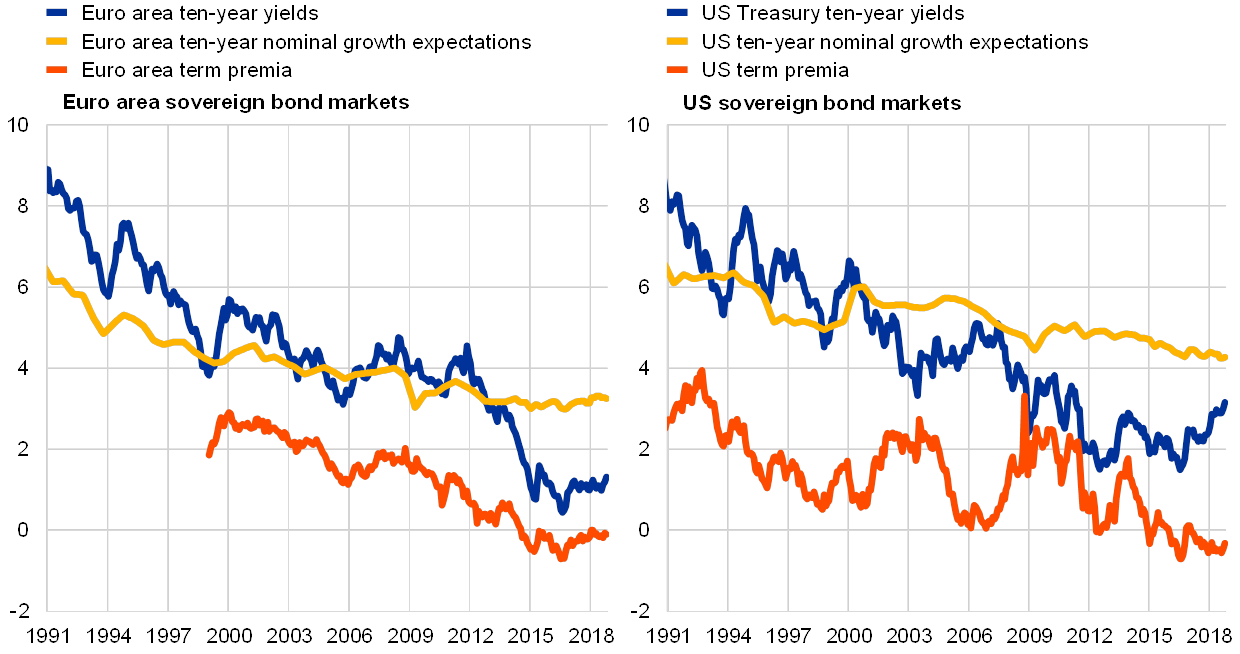 Long-term government bond yields, nominal GDP growth expectations and term premia in the euro area and the United States