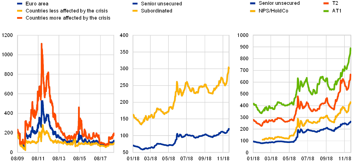 Euro area bank stock prices were lower, in part owing to higher political uncertainty. Euro area banks’ stock prices fell sharply, by about 25% since early May, owing to earnings expectation downgrades, while higher political uncertainty in Italy and renewed market turmoil in EMEs drove up the risk premia required on bank stocks. Across countries, Italy stood out with the Italian bank index dropping by about 37%. Furthermore, co-movements between government bond and bank stock prices in Italy recently reached levels not observed since the peak in 2011-12 (see Chart 12, left panel). Apart from global factors, the sharp repricing of Italian bank stocks likely reflected the sector’s holdings of domestic sovereign bonds (see Chart 12, right panel). In addition, spreads on Italian bank bonds increased, with the largest spread widening having taken place for the most credit-sensitive asset classes (see Box 7).