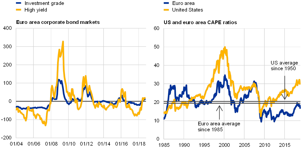 Note: In the left panel, the excess bond premium is defined as the deviation of credit spreads from measures of credit risk and liquidity risk at individual bond level. Right panel: CAPE stands for cyclically adjusted price-earnings ratio.