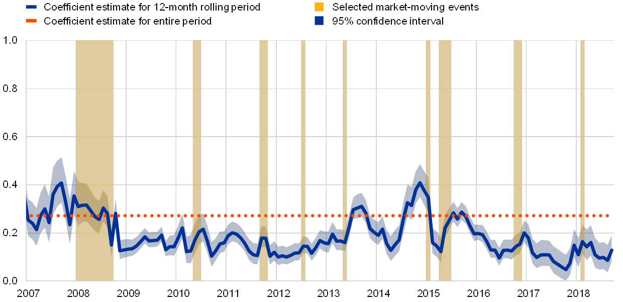 Within the euro area, debt sustainability concerns have remained country-specific. The composite indicator of systemic stress in the euro area sovereign bond markets (SovCISS) picked up slightly in May and remained stable thereafter (see Chart 8). The key driver for the somewhat higher systemic stress was related to political developments in Italy and, in particular, to market concerns about the government’s deficit targets for the coming years and the resulting implications for debt sustainability. Overall, the SovCISS still continues to fluctuate at low levels, indicating no generalised near-term debt sustainability concerns for the euro area as a whole.
