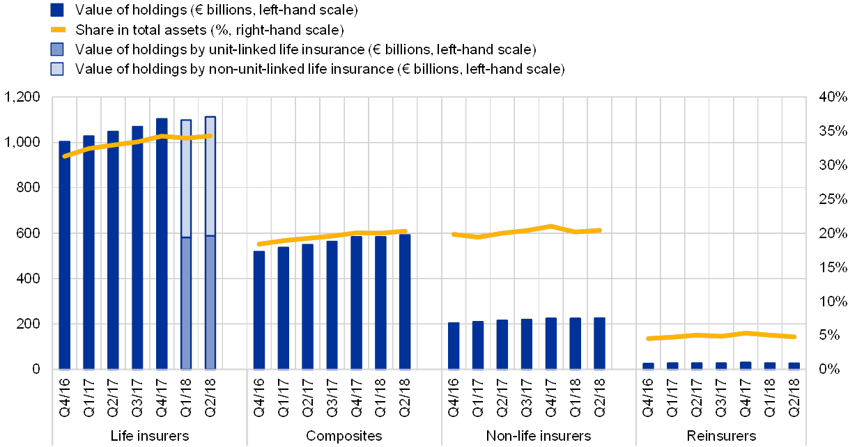 53. Although life insurers have been adapting their business models by shifting towards unit-linked products in recent years, the traditional saving policies with guaranteed rates (non-unit-linked policies) continue to dominate life insurers’ liabilities. For more details, see Financial Stability Review, ECB, May 2018, Section 3.2.