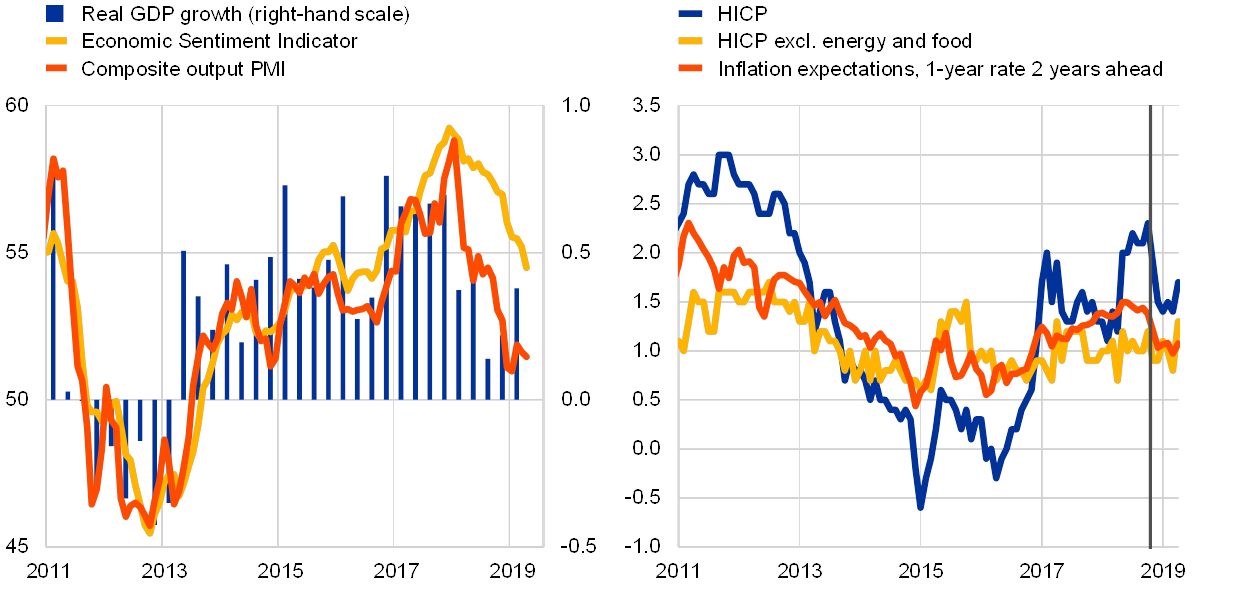 The euro area economy lost some momentum in late 2018. Notwithstanding a rebound of GDP growth at the start of 2019, survey indicators continue to point to a subdued economic expansion in the near term. The slowdown in euro area growth (see Chart 1.1, left panel) can be attributed to weaker impetus from external demand as well as some country and sector-specific factors, such as disruptions in the German car industry and adverse confidence effects of the political and policy uncertainties in Italy. That said, the ECB’s accommodative monetary policy has continued to underpin domestic demand. Ongoing favourable labour and housing market trends have also buttressed private consumption, while benign financing conditions and relatively resilient corporate and household fundamentals underpinned business and residential investment.