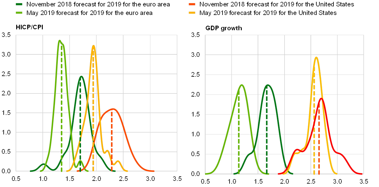 Notes: Left panel: the forecasts are based on the March 2019 ECB staff macroeconomic projections for the euro area (solid lines) and the December 2018 Eurosystem staff macroeconomic projections (dotted lines). The darker grey shaded area represents the range between the 25th and 75th percentiles, while the lighter grey shaded area displays the range between the 10th and 90th percentiles. Middle panel: the forecasts are taken from Consensus Economics. Right panel: the distributions are based on the ECB’s Financial Stability Risk Index. For further details of the methodology, see the May 2018 FSR special feature entitled “A new Financial Stability Risk Index (FSRI) to predict near term risks of recessions”. The blue GDP distribution is centred around the Q2 2019 GDP forecasts reflected in the September 2018 ECB staff macroeconomic projections for the euro area. The yellow GDP distribution is centred around the Q4 2019 GDP forecasts reflected in the March 2019 ECB staff macroeconomic projections for the euro area.