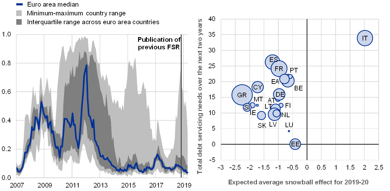 A prolonged period of low growth may unearth debt sustainability concerns. Although the aggregate stock of public debt in the euro area has fallen somewhat since the peak of 2014 (standing at around 87% of GDP in 2018), the stock has continued to increase in some of the highly indebted countries. Should downside risks to growth materialise, financing costs for vulnerable sovereigns are likely to increase and may unearth debt sustainability concerns. In addition to the high level of debt and large fiscal deficits, some countries could face rollover risks if market participants reassess sovereign risk (see Chart 2, right panel). A sound medium-term approach to public finances, as expected under the Stability and Growth Pact, is key to containing public financing costs, which would support debt sustainability.