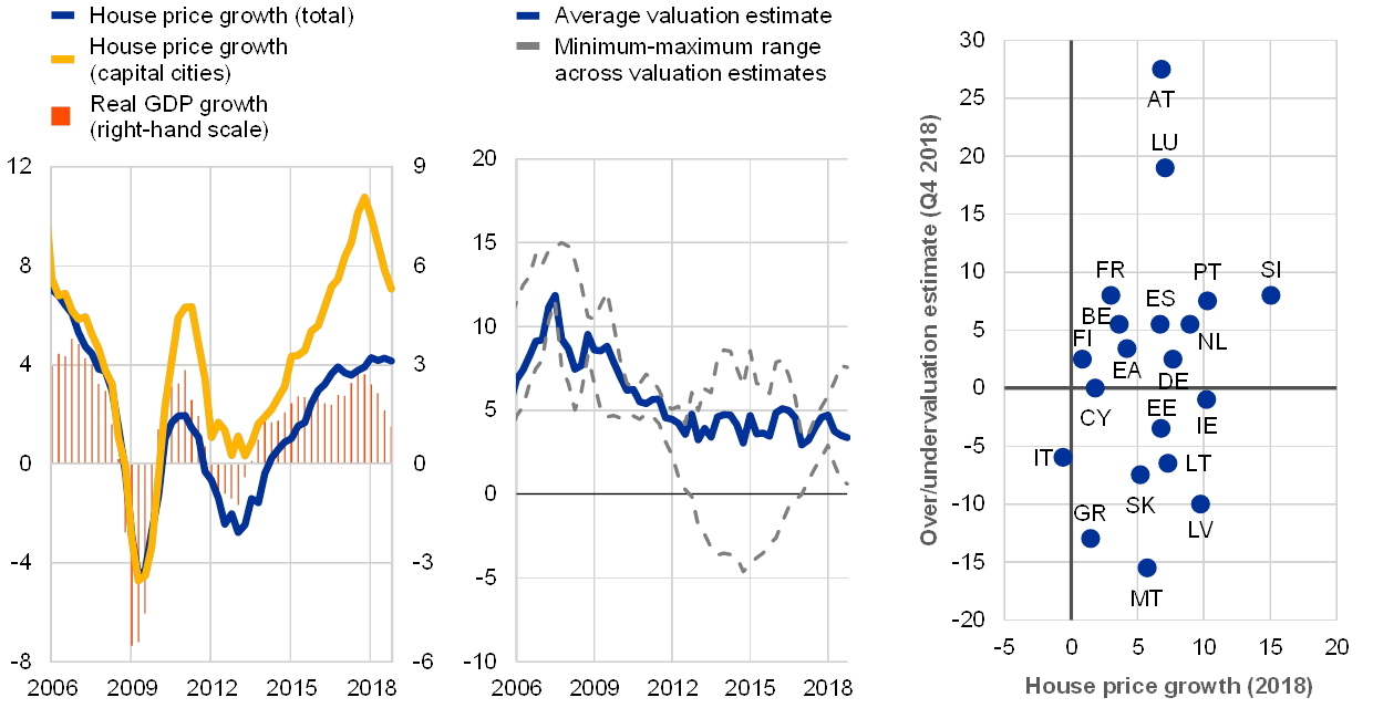 Real estate prices in the euro area have continued to rise despite the more challenging macroeconomic outlook. House prices in the euro area grew by 4.2% in 2018, contributing to signs of mild overvaluation for the euro area as a whole. Moreover, the post-crisis decline in household indebtedness appears to have slowed down significantly.