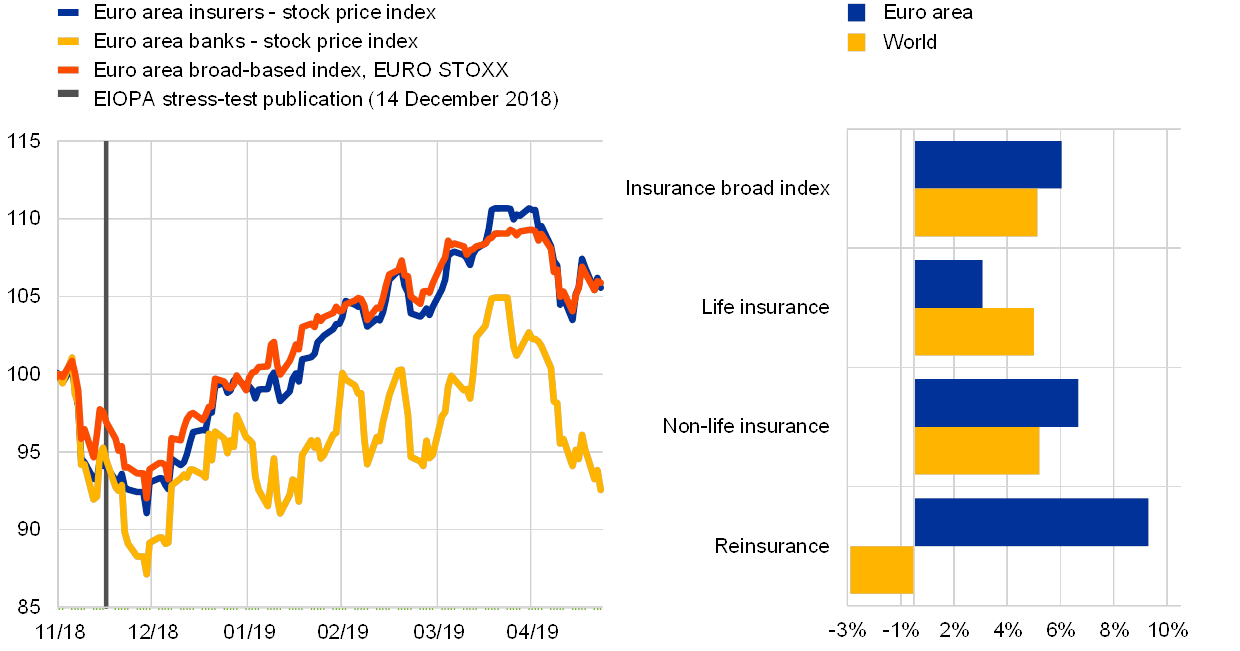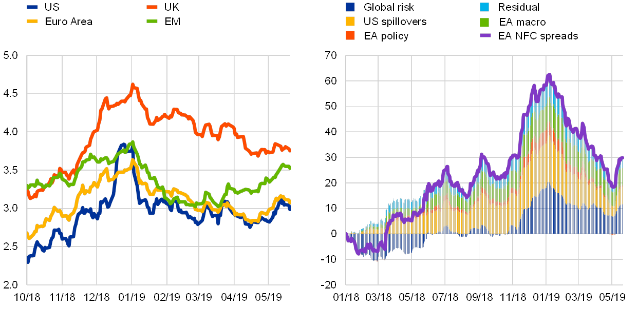 Greater economic and policy uncertainty has contributed to bouts of high volatility in financial markets. In December last year, global stock markets and the riskier parts of the corporate bond markets sold off sharply after a prolonged period of rising asset prices. Concerns about the economic cycle and – in some cases – high valuations triggered the corrections. While the December turmoil was orderly and without immediate widespread consequences, the episode illustrated that investor sentiment can prove unpredictable. In the first four months of 2019 market sentiment improved and the financial assets affected by the turmoil recovered most or all of the earlier losses. The greater risk appetite in financial markets was partly attributed to central bank communication assuring market participants of a continued accommodative stance. More recently, concerns about escalating trade sanctions between the United States and China once again prompted declines in equity and corporate bond prices, as risk premia increased.