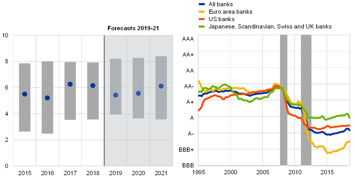 Euro area banks’ actual (2015-18) and expected (2019-21) return on equity (left panel); median ratings for large global listed banks (right panel)