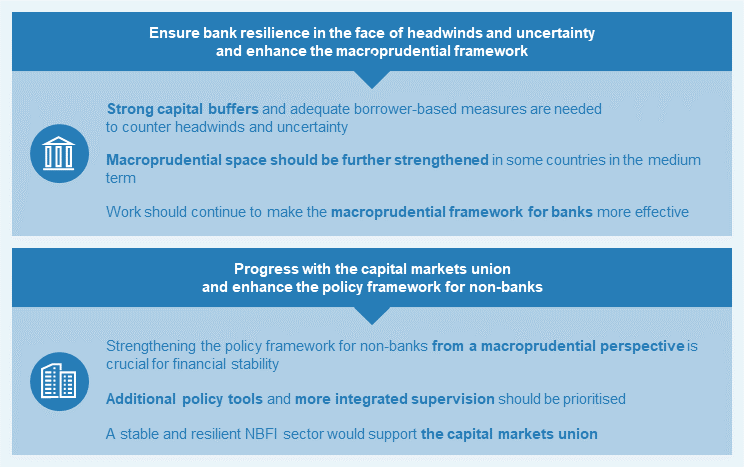 Focused on building resilience ex ante | Policy measures should focus primarily on building resilience and reducing the potential for contagion by mitigating existing vulnerabilities ex ante. Tools used to address systemic risk after a shock has materialised can usefully complement the toolkit, but they are no substitute for measures that mitigate risk ex ante. |