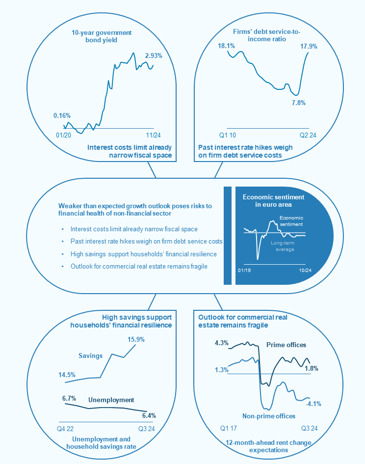 Meanwhile, sovereign vulnerabilities are deepening. Despite recent reductions in debt-to-GDP ratios, fiscal challenges persist in several euro area countries, exacerbated by structural issues such as weak potential growth and heightened policy uncertainty. While non-financial sectors appear broadly resilient, there are credit risk concerns for some euro area households and firms, particularly in the real estate sector and among lower-income households and small and medium-sized enterprises which would be most affected should growth slow.