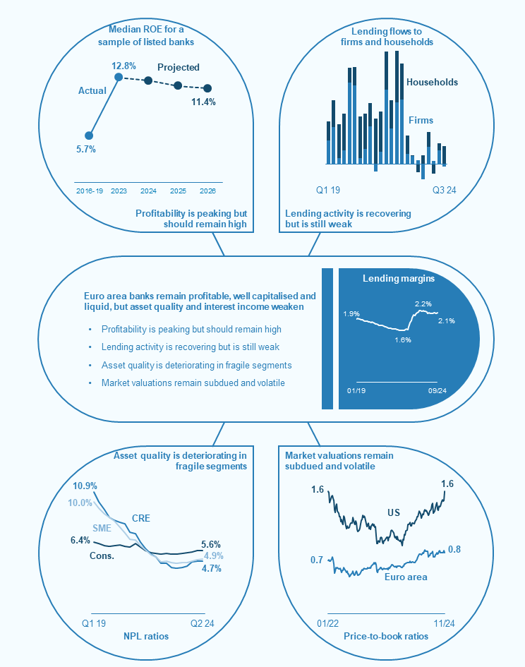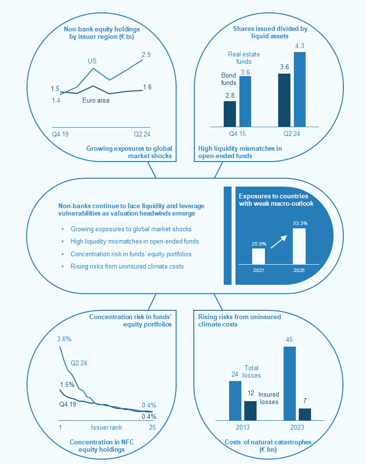All in all, sources of risk and vulnerability for financial stability have remained elevated since the previous issue of the Financial Stability Review was published. While financial markets and non-banks have proven resilient to recent bouts of volatility, the likelihood of tail events remains high as the balance of risks shifts in the euro area from concerns about inflation remaining high to fears over growth. In a context of elevated macro-financial and geopolitical uncertainty, there could be a sudden sharp reversal in risk sentiment, given high asset valuations and concentrated risk exposures in the financial system. Political and policy uncertainties have turned the spotlight back on sovereign risks, causing sovereign vulnerabilities to rise. Possible escalation in tensions associated with the conflicts in the Middle East and Ukraine, plus heightened trade policy uncertainty, could trigger a weakening of macro-financial conditions, with repercussions for credit risk in the financial and non-financial sectors.
