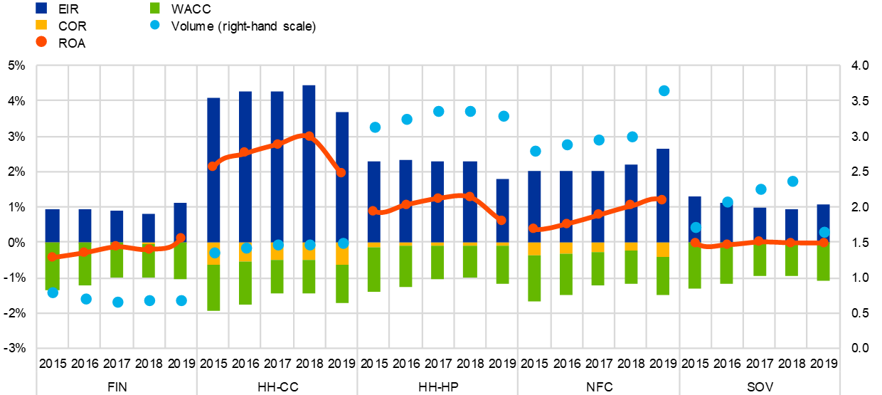 Notes: COR: cost of risk; EIR: weighted-average effective interest rate; ROA: weighted-average risk-adjusted return on assets; WACC: weighted-average cost of capital. FIN: financial corporations; HH-CC: household consumer credit; HH-HP: household mortgages; NFC: non-financial corporations; SOV: sovereigns. Given the lack of historical data for the year 2018, 2018 baseline projections from the 2018 stress-test exercise are used as an approximation. This may lead to some bias in the corresponding data.
