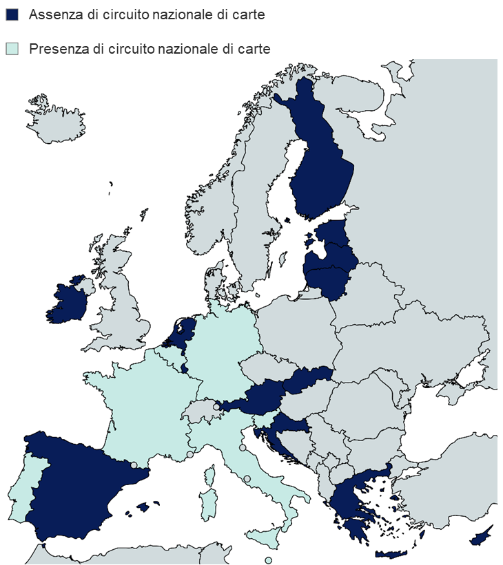 I pagamenti digitali nell’area dell’euro rimangono inoltre frammentati, sia lungo i confini nazionali sia in termini di utilizzo. Le attuali soluzioni europee per i pagamenti digitali soddisfano principalmente i mercati nazionali e specifici casi d’uso. Per poter pagare in tutti i paesi europei i consumatori devono ricorrere ai pochi fornitori non europei, che oggi occupano perlopiù una posizione di mercato dominante per quanto riguarda queste operazioni. Nella seconda metà del 2023 i circuiti di carte internazionali hanno regolato oltre due terzi dei pagamenti con carta nell’area dell’euro[10]. E 13 paesi su 20 nell’area dell’euro ricorrono interamente a soluzioni non europee in assenza di uno schema di pagamento nazionale. Ma neanche queste soluzioni di pagamento internazionali sono accettate ovunque e rispondono a tutte le principali esigenze d’uso internazionale (pagamenti nei negozi, da persona a persona e online).