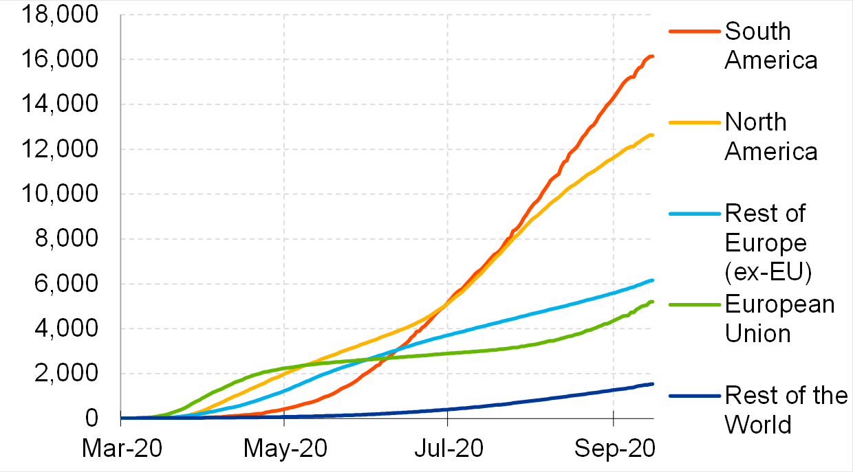Significant cross-country differences can already be identified when considering the development of COVID-19 cases over time. The figures in Europe have been relatively benign by international standards, while North and South America, for instance, have reported considerably more dramatic increases in total infection numbers (Figure 1).
