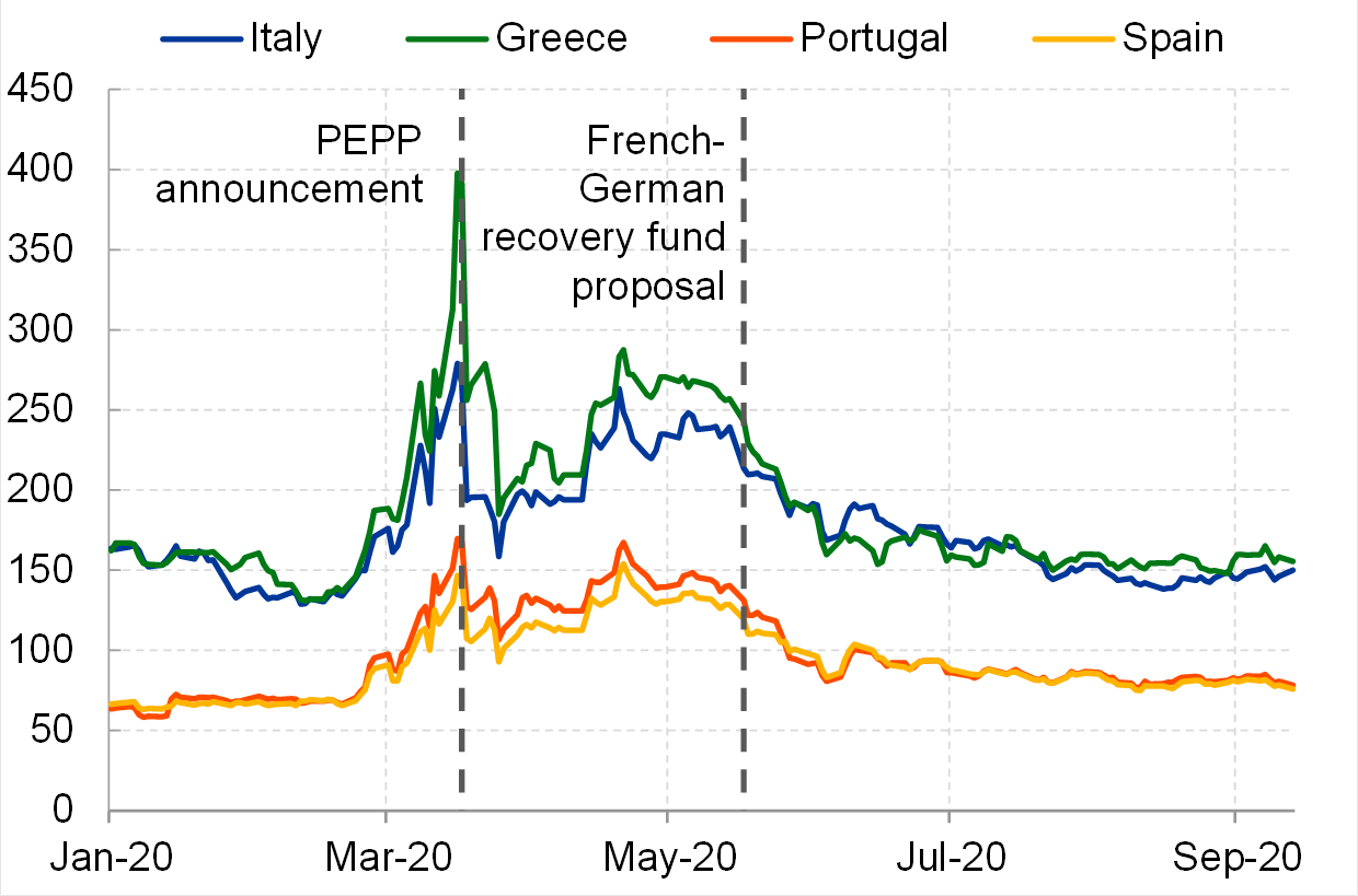 However, risk premia on government bonds did not decrease solely because of the monetary policy response. In addition, the agreement on a large-scale rescue package at European level contributed to a normalisation of risk premia. The fiscal support measures comprising loans and transfers were essential in reducing risk premia to their pre-crisis levels.