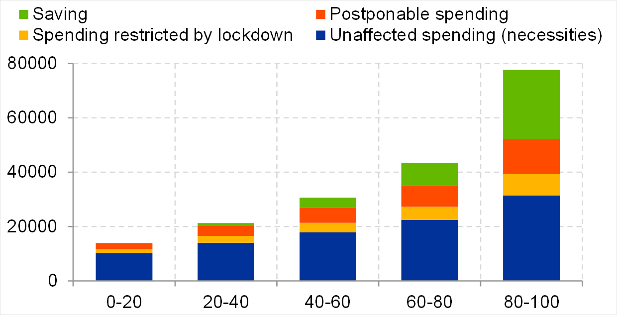Note: The chart shows the structure of household expenditures (spending) and saving across income quintiles. Blue bars denote necessities, items unaffected by lockdown, such as food at home, housing and utilities, health items, communications and education. Yellow bars denote items restricted by the lockdown, such as food in restaurants, transport services, holidays, hotels and cultural services. Red bars denote postponable spending items, such as purchases of motor vehicles, clothing and footwear, and furnishings and furniture. Green bars show household saving. The chart shows an aggregate of Germany, Spain and France.