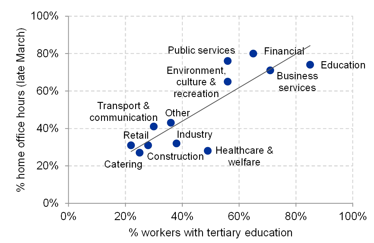 Furthermore, the impact of the lockdown measures is also associated with individuals’ education level. In the Netherlands, for example, sectors with a higher share of work hours spent in home office during the crisis tend to have a higher proportion of employees with tertiary education (Figure 15). Employees in these sectors are presumably less affected by short-time work schemes and income shortfalls, given that they were able to continue working from home during the pandemic period.