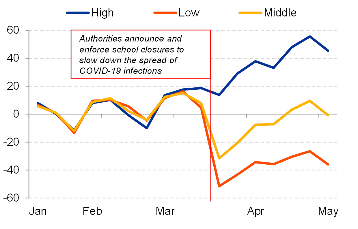 The lockdown measures could also lead to a worsening of inequality for individuals who are still in school. For example, during the period of home schooling in the wake of the pandemic, students from US districts with higher average household incomes earned a higher number of badges for completing online courses relative to those from districts with lower incomes (Figure 16). The observed dispersion of learning outcomes is primarily problematic because it could lead to lasting differences in human capital accumulation, thus causing inequality to increase in the long run.