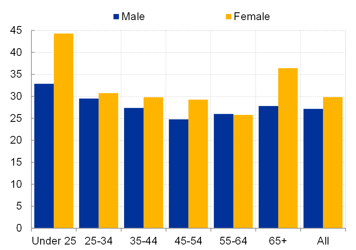 On the one hand, the share of young employees in sectors that have been particularly affected by the government-imposed containment measures is relatively high. On the other hand, women across almost all age groups are more heavily affected by the restrictions than men (Figure 17).[9]
