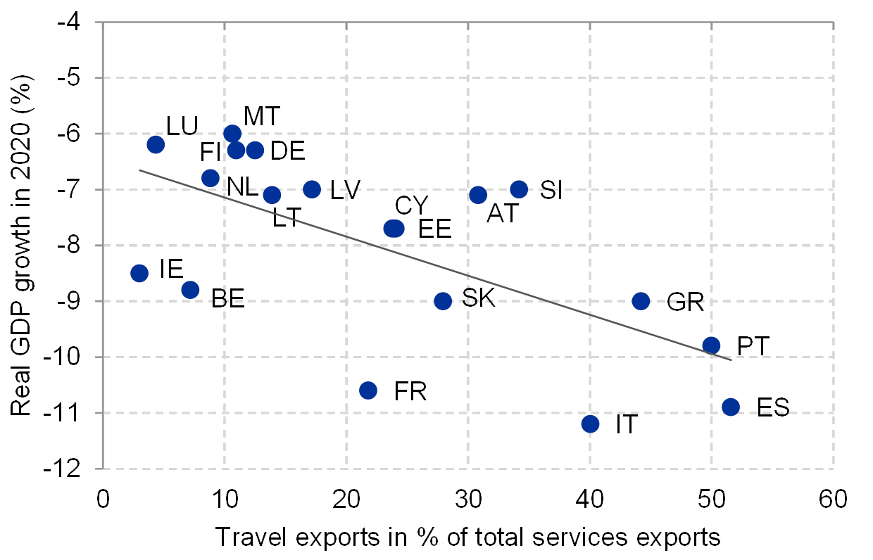 Europe-wide travel restrictions and the drop in demand for travel abroad led to considerable economic losses in countries with a relatively high dependency on tourism, such as Greece or Spain. A correlation analysis shows that the projected drop in economic activity tends to be most pronounced in those countries (Figure 6).