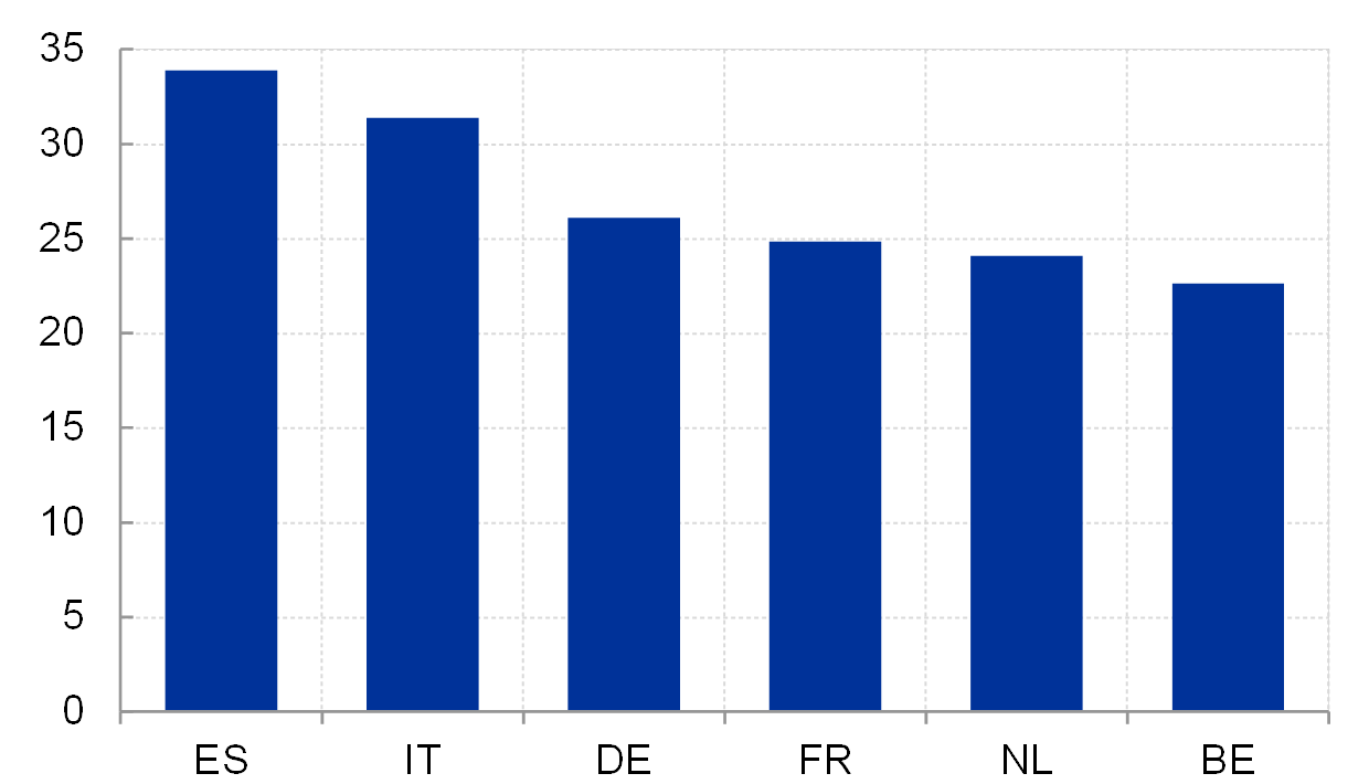 Note: The chart shows the distribution of the share of employees in lockdown sectors across 6 largest euro area countries. Lockdown sectors are: wholesale and retail trade, repair of motor vehicles and motorcycles; transporting and storage; accommodation and food service activities; arts, entertainment and recreation (sectors G, H, I and R in the Statistical Classification of Economic Activities in the European Community (NACE) classification).