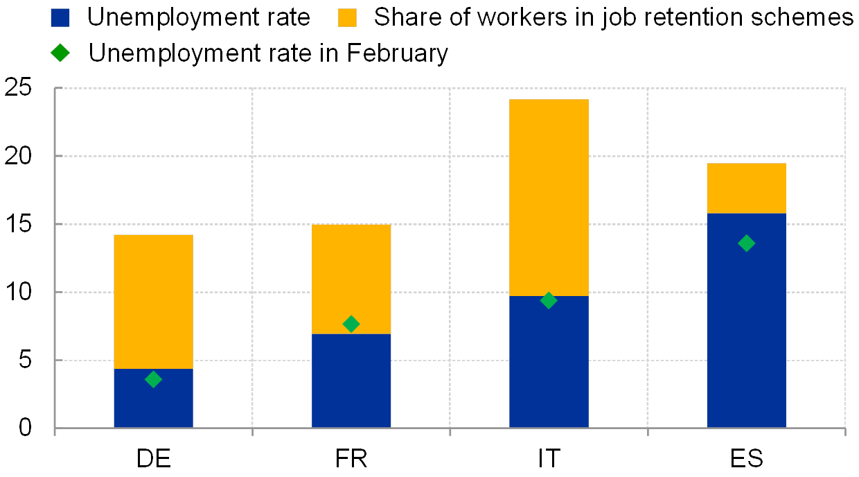 Despite the magnitude of the economic downturn, unemployment has only increased marginally so far (Figure 8). This partly results from a drop in labour market participation, given that some individuals currently do not actively seek employment due to social distancing rules or childcare duties.[3] Moreover, euro area countries have implemented large-scale job retention programmes, thus preventing lay-offs and unemployment. The German Kurzarbeitergeld (short-time work allowance) is an example of such a scheme. In the context of these government support programmes, significant heterogeneity across member countries is also apparent. Nevertheless, due to these measures, a considerable increase in unemployment was most likely averted in all countries.