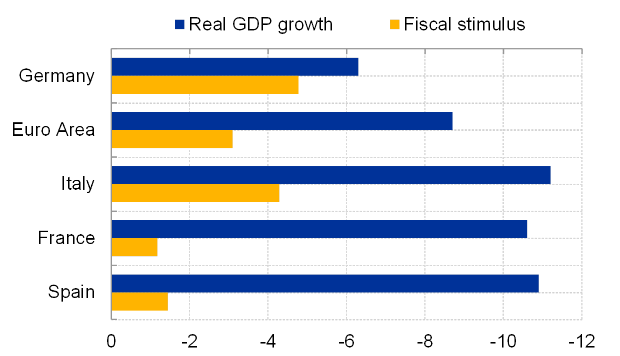 Note: Real GDP growth estimates are based on data published by the European Commission (Summer Economic Forecast, July 2020). Fiscal stimulus estimates are based on data published by the European Commission (Spring Economic Forecast, May 2020), the most recent harmonised projection. These estimates therefore do not include the latest announcements of fiscal support measures. Fiscal stimulus is calculated as the change in the primary deficit, adjusted for cyclical effects.