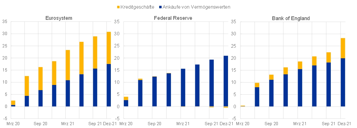 Anmerkung: Ankäufe von Vermögenswerten durch das Eurosystem umfassen alle Ankäufe im Rahmen des PEPP und des APP. Zu den Kreditgeschäften zählen alle GLRGs, PELTROs, HRGs und LRGs. Die Wertpapierkäufe der Federal Reserve umfassen alle Schatzwechsel, -anweisungen und -obligationen sowie inflationsgeschützte und variabel verzinsliche US-Staatsanleihen. Hierzu zählen auch Agency Bonds und Agency Mortgage-Backed Securities. Zu den Kreditgeschäften zählen sämtliche Repogeschäfte, Kredite und Geschäfte im Rahmen der Commercial Paper Funding Facility II, Corporate Credit Facility, Municipal Liquidity Facility, des Main Street Lending Programme und der TALF II. Zu den Wertpapierkäufen der Bank of England zählen alle britischen Staatsanleihen und Unternehmensanleihen, die im Rahmen der Asset Purchase Facility gehalten werden. Zu den Kreditgeschäften zählen alle Geschäfte im Rahmen von ILTR, CTRF, TFS und TFSME. Die letzten Angaben beziehen sich auf Dezember 2021.
