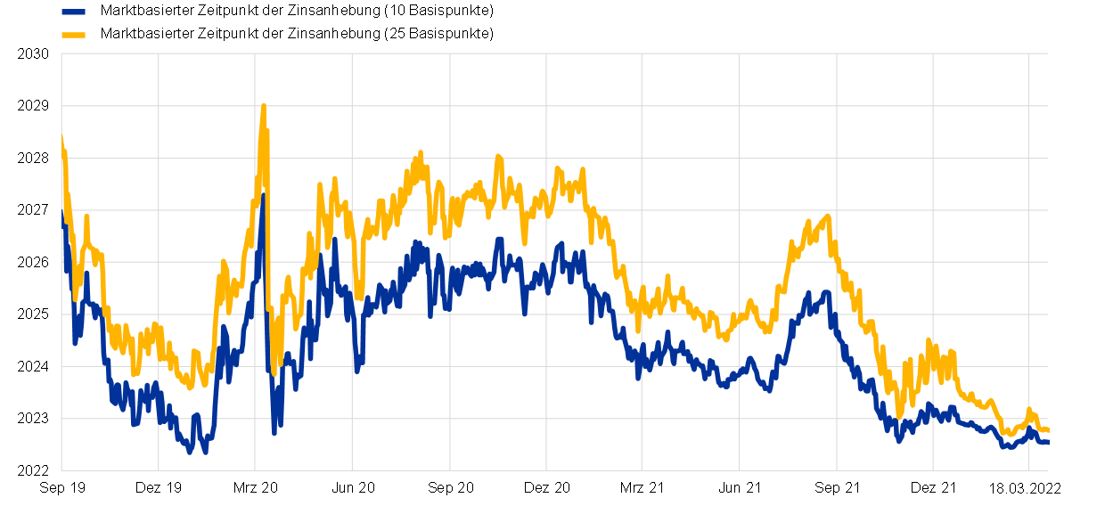 Anmerkung: Der marktbasierte Zeitpunkt der Zinsanhebung ist der Zeitpunkt, zu dem der €STR-Terminzinssatz den aktuellen €STR-Zinssatz um mindestens 10 Basispunkte oder 25 Basispunkte übersteigt. Die letzten Angaben beziehen sich auf den 25. März 2022.