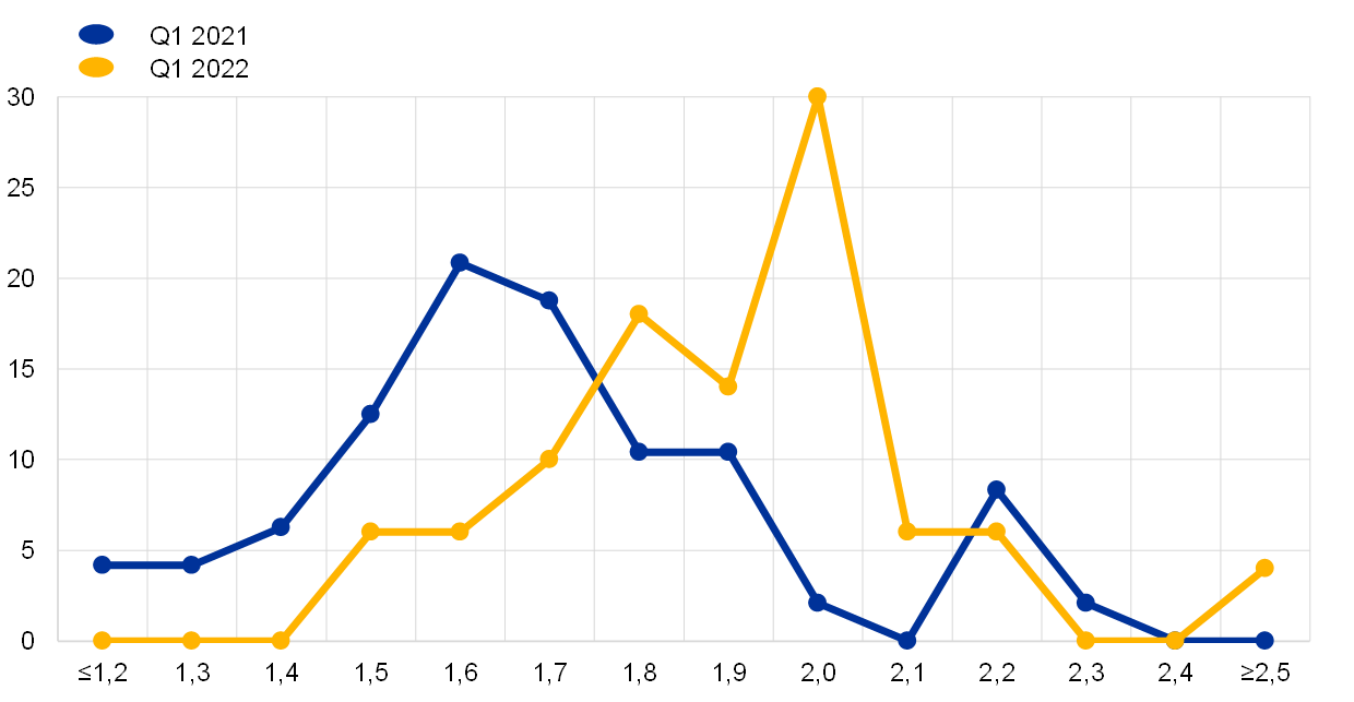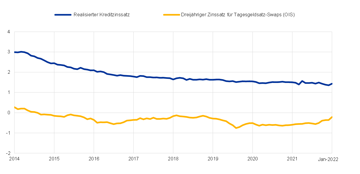 Anmerkung: Die Intermediationsdifferenz ist die Differenz zwischen dem Basissatz (Dreijahres-OIS) und dem realisierten Kreditzinssatz, gemessen am beobachteten Zinssatz für Kredite an nichtfinanzielle Kapitalgesellschaften. Die letzten Angaben beziehen sich auf Januar 2022.